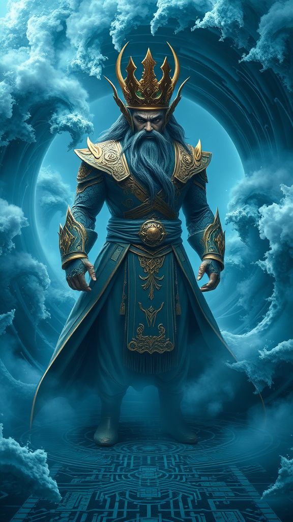 Majestic ocean sovereign with a fierce demeanor stands amid crashing spiral waves, enveloped in blue mist and fog. His presence is commanding and regal, with perfect facial features, depicted in a hyper-realistic, full-body portrayal. He stands on a ground resembling an intricate circuit board and wears elaborate, opulent clothing, epitomizing fantasy elegance. This scene exudes a dark fantasy atmosphere, filled with intricate details and a cinematic scope worthy of a high-quality Artstation masterpiece. Rendered in ultra-high 8k resolution with photorealistic concept art quality, the piece boasts sharp focus, perfect composition, and dramatic interplay of intense shadows and lighting, offering an HDR high-definition visual treat.