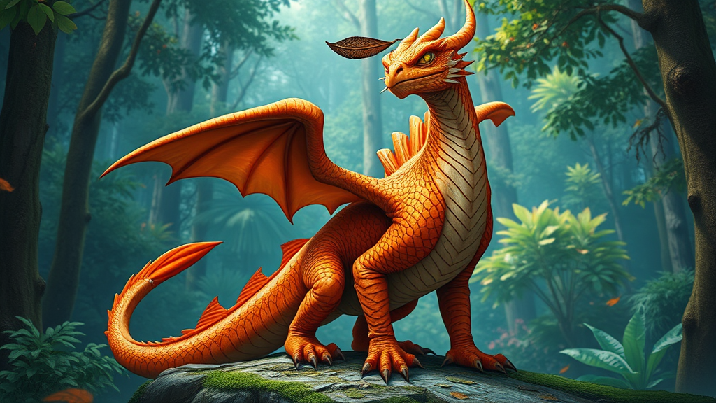 Majestic orange dragon perched gracefully in a vibrant forest, dnd character essence, rich background focus, enchanting fantasy atmosphere, intricately textured skin, adorned with a single eagle feather, powerful falcon-like wings, standing firm on lizard legs, raptor aura, komodo dragon stance, large luminous eyes, exuding a mystical presence.
