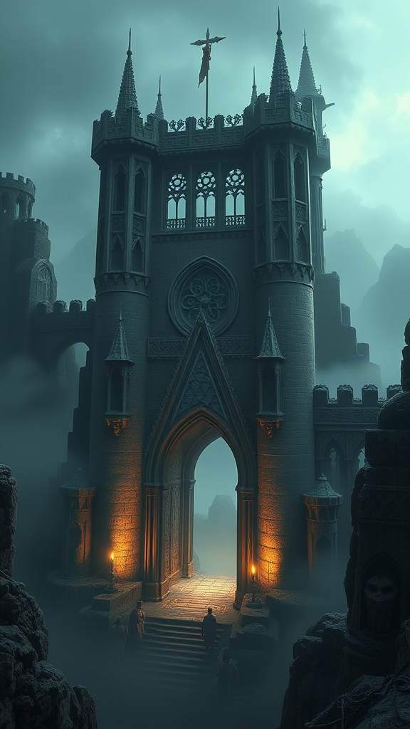 Majestic panoramic view of an eerie Gothic Hellgate Tower, shrouded in dim underworld tones, an ethereal masterpiece woven with shadows, crafted by expert hands; astoundingly detailed, pushing the limits at 32k resolution, with intricate nuances inspired by Tom Bagshaw, Antonio Manzanedo, Artgerm, James Jean, Brian Froud, Ross Tran, interwoven with elements of DnD art, CCG and VT, the imagery bursts with highly detailed, hyper-realistic features, a symphony of 4K HD splendor that captivates the imagination.