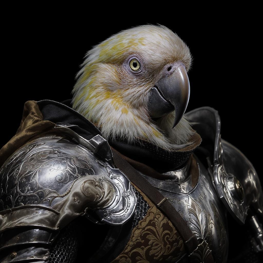Majestic parrot knight, regal portrait, exquisite armor with elaborate artistry, shimmering silver, luxurious silk accents, captivating cinematic lighting, intense dramatic illumination, rendered in stunning 4k detail.