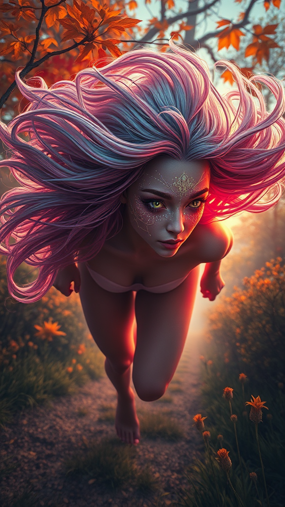 Majestic perspective of an otherworldly female being with iridescent hair, mesmerizing kaleidoscope eyes, sprinting through an autumnal garden at dawn's gentle breeze, rendered in an alcohol ink painting style. Inspired by the visionary art of Ross Tran, Antonio J. Manzanedo, Tom Bagshaw, and Mandy Disher, the scene evokes a psychedelic essence akin to a Steven Spielberg epic film, captured in ultra-detailed 32k cinematic stills. The composition features hyper-realistic elements reminiscent of ArtStation masterpieces, showcasing meticulous character design and concept art enveloped in a lush matte painting landscape.