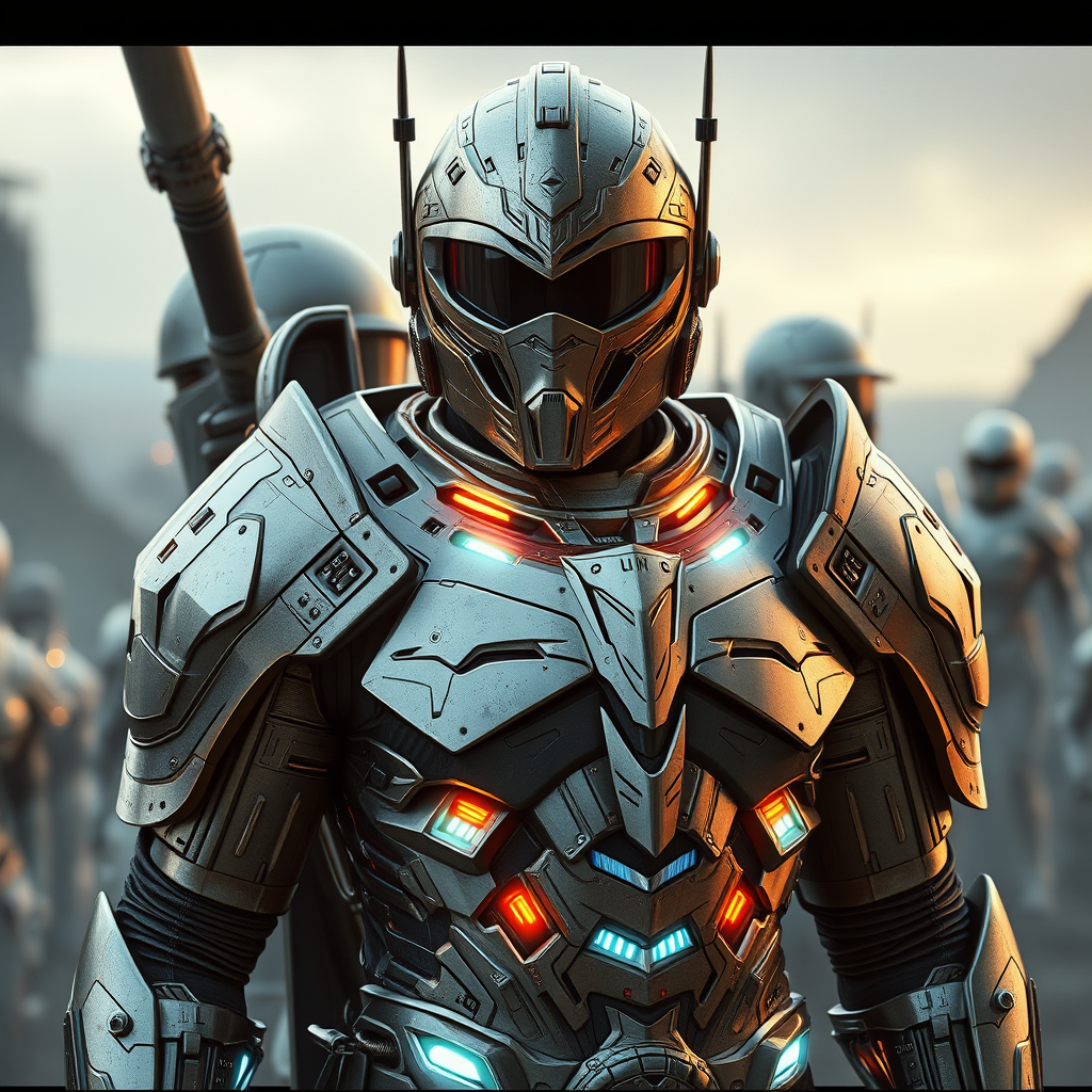 Majestic photoshoot featuring a futuristic soldier in regal armor infused with advanced cyber technology, leading the imperial army, artistic inspiration drawn from the works of Adam Fisher, with slight enhancements to emphasize the interplay of shimmering metallic textures and glowing digital accents against a backdrop of a grand, dystopian landscape.