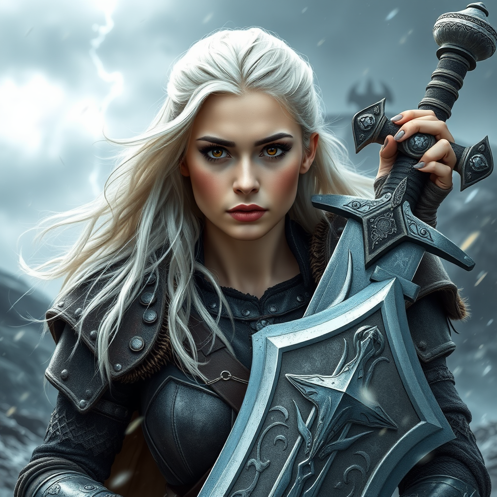 Majestic platinum blonde Viking woman with captivating brown eyes and a tender, beautiful face, possessing full lips, dressed in intricate armor, wielding an imposing sword as she strides confidently through an enchanting storm-filled landscape where magic crackles in the air.