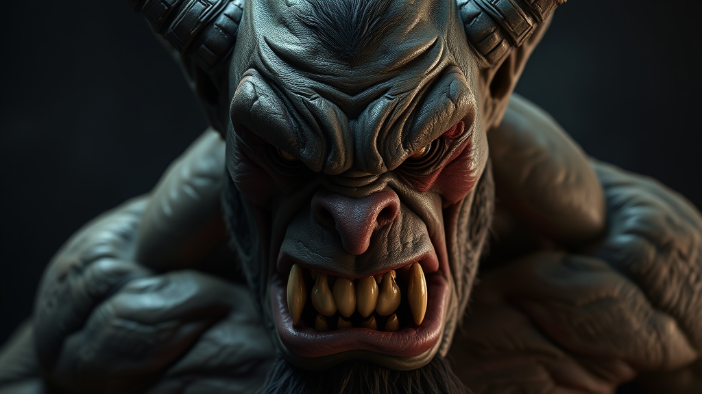 Majestic portrait of a furious orc, exuding an intimidating and menacing presence, captured from a low angle to emphasize its formidable power. The orc's intense expression is highlighted by horror-infused dramatic lighting, with every wrinkle and vein rendered in sharp focus. The composition features smooth, finely detailed textures and a high-definition, 4K octane render. Inspired by the artistic styles of Stanley Lau, Jason Chan, and Mark Hill, this masterpiece is trending on ArtStation, combining elements of fantasy with a terrifying realism.