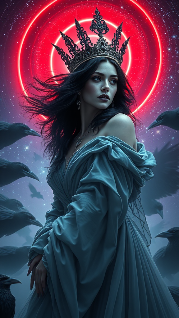 Majestic queen of ravens, captivating and mysterious, standing poised with an air of authority as she commands her raven legion. Her striking black hair cascades like a satin waterfall, framing a face adorned with icy blue and black lipstick. Her deep, enigmatic eyes echo the Pantone 2766 hue, piercing through the psychedelic swirl of a birth canal backdrop. Dressed in a gossamer silk gown that seems to ripple with ethereal light, she stands in an otherworldly realm resembling the intricate landscapes of World of Warcraft. A constellation-studded background envelops her, an iridescent red halo casting a divine glow. Her ornate, ethereal crown glistens as god rays trace her silhouette with radiant light, enhancing the dramatic, low-angle perspective. The scene is a spectacle of cinematic hyperrealism — detailed and ultra-real, accentuated by a sharp focus akin to octane render. An epic wide shot captures the dark fantasy environment, merging macabre elegance with atmospheric, photorealistic artistry, reminiscent of Greg Rutkowski's style.