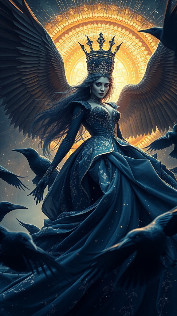 Majestic queen of ravens in motion, enigmatic allure, cosmic plumes swirling, commanding the cosmos, icy sapphire hair flowing, eyes the deep hue of Pantone 2766, in a world akin to Warcraft, draped in a silk gossamer celestial gown, speckled with stars and galaxies, full-body portrayal in the style of John Singer Sargent, crowned with an ethereal, ornate tiara, captured from a low angle, bathed in god rays and radiant light, by Greg Rutkowski, set against an iridescent golden halo backdrop, ultra-realistic with a meticulously detailed setting on ArtStation, evoking dark fantasy, atmospheric hyperrealism, intricately detailed, in an expansive, epic wide shot, photo-realistic with sharp focus, rendered in Octane, possessing a cinematic quality within a 16:9 aspect ratio.