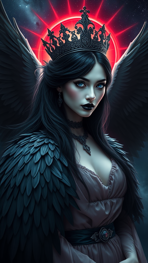 Majestic queen of ravens with an enigmatic allure exudes power and mystery; a femme fatale cloaked in black plumes mesmerizingly leads her winged legion. Her jet-black hair cascades like obsidian waterfalls, complementing her icy blue intention-filled gaze that matches Pantone 2766. A whisper of black lipstick accentuates her ethereal beauty. In a realm reminiscent of World of Warcraft, the scenery is psychedelic and surreal, intertwining with cosmic birth canal motifs. Draped in a delicate silk gossamer dress that flutters in the celestial winds, she embodies the night sky's tapestry amid a galaxy-strewn backdrop. A crown, ornately magnificent, adorns her head, framing her figure in regal splendor, while radiant god rays cast a heavenly glow. The iridescent red halo behind her intensifies the otherworldly scene, suffusing the macabre ambiance with light. The environment is richly detailed, dark fantasy engulfs the frame in atmospheric hyperrealism. An ultra-realistic, epic wide-angle shot captures the grandeur in sharp focus, depicting an extraordinary queen in a moment of commanding grace, enhanced by the meticulous finesse of octane-rendered cinematography.