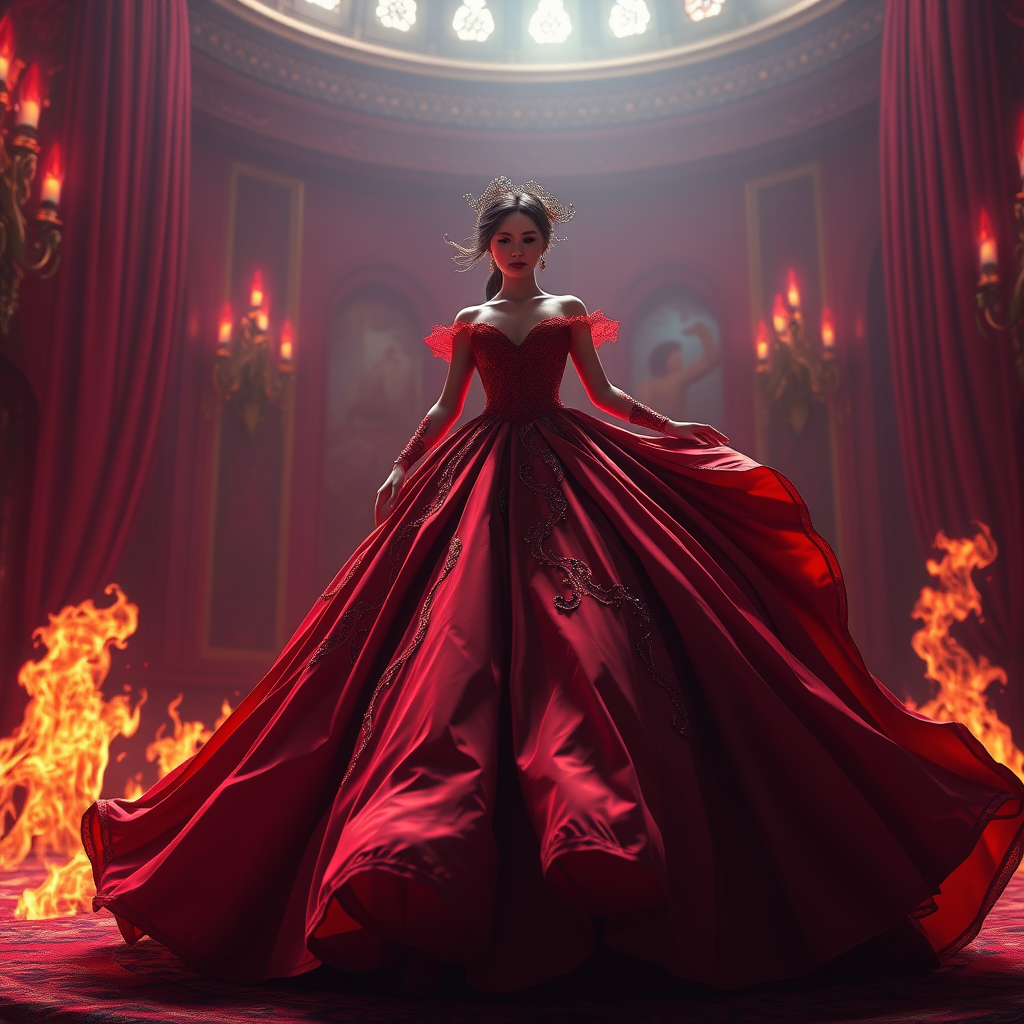 Majestic red ball gown ablaze from the hem, flames dancing upward, vividly scarlet, full-length and expansive, capturing the essence of a grand portrait. Intricately detailed concept art evocative of Artstation, rendered in stunning clarity with Octane, imbued with cinematic lighting. Embracing an otherworldly allure, the image is captured in breathtaking 8K resolution, melding fantasy and reality with subtle creative enhancements.