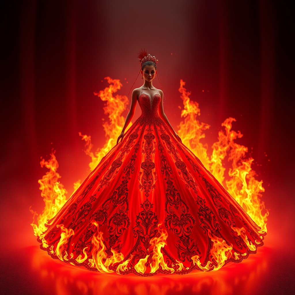 Majestic red ball gown, blazing from the hem upward, engulfed in flames, intensely vivid red, expansive and elegant, showcasing full body, highly intricate detailing, concept art flair, Artstation-inspired, fantasy realm, rendered in Octane with cinematic lighting, ethereal and otherworldly ambiance, ultra-high-definition 8K resolution.