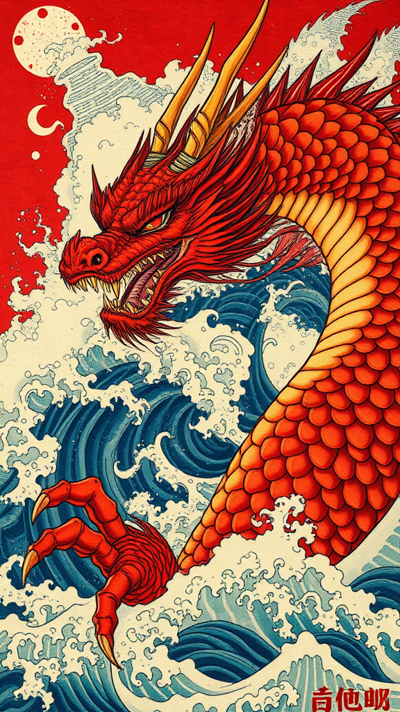 Majestic red dragon surfing turbulent waves, depicted in the distinctive style of kōji morimoto with a neo-traditional Japanese twist, reminiscent of John Blanche's intricate murals and wall drawings. Inspired by Tyler Walpole's dynamic compositions, the scene offers intense close-ups that reveal the dragon's intricate scales and fiery eyes. Embracing an absurdist angle, the artwork captures a surreal fusion of myth and nature, with vibrant colors and swirling patterns that evoke both chaos and harmony.