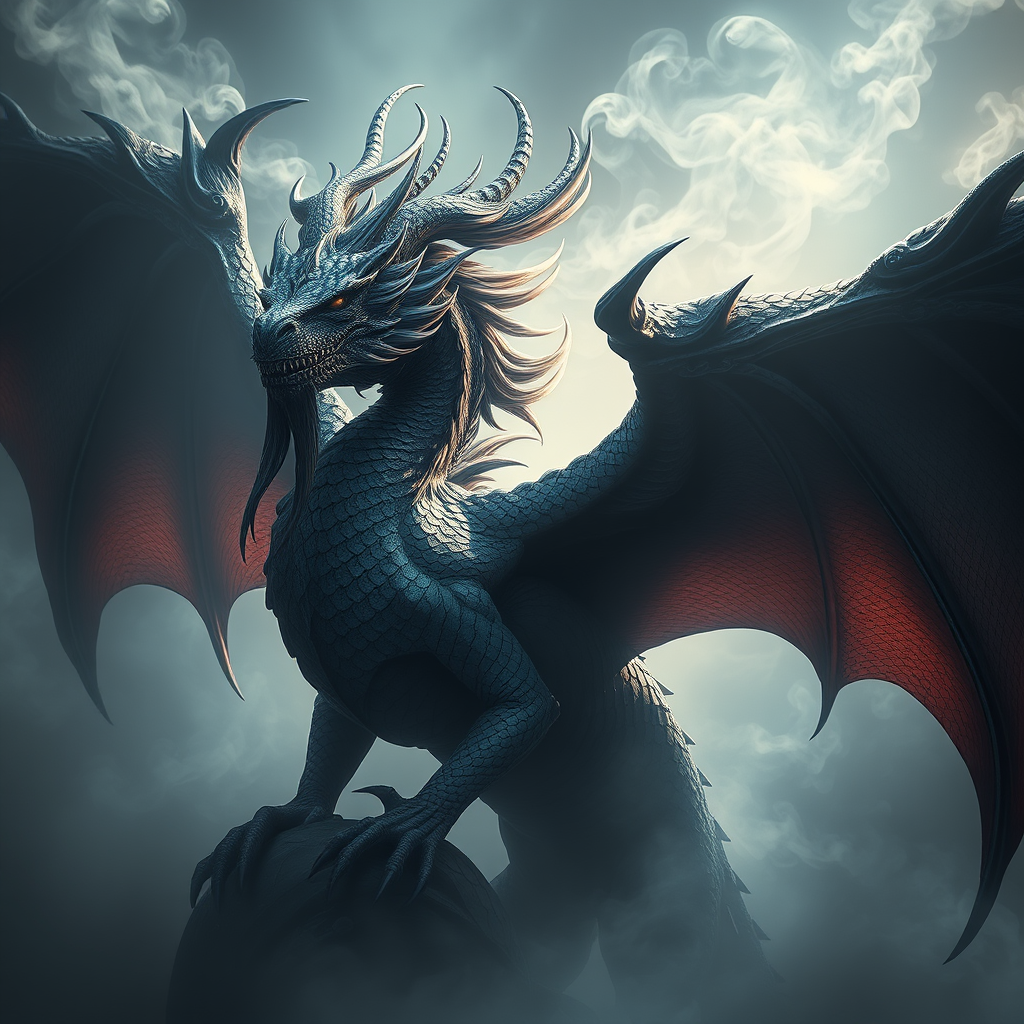 Majestic royal colossal dragon with flowing ebony wind-swept mane and shimmering scaled wings, Magic the Gathering essence, ethereal pale skin with striking high contrast, swirls of mystical smoke enveloped in a luminous misty backdrop, inspiration by Andrei Riabovitchev, JohnnyD, Massimo Caggese, Peter Mohrbacher, intricate ominous design, octane-rich texture, inspired by Moebius, Arney Freytag aesthetics, poised in a fashion photo shoot stance, ArtStation caliber, intense lighting and shadows, infused with orthodox symbolism, concept art infused with ambient magic realism, 8k resolution level detail, exceptionally complex hyper-detailed cinematic tribal dark fantasy elements.