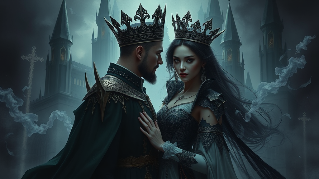 Majestic royalty entwined in shadowy mystique, Magic the Gathering aura, vivid contrasts swirling amidst ethereal specters within a vast, shadowed castle backdrop. Captivating pose in portrait form, atmospheric with Orthodox symbols and tribal dark fantasy essence. Depth conveyed through dramatic shadows and emotional, intricate detailing, accentuated by ambient occlusion. ArtStation-worthy composition with a touch of enigmatic allure.