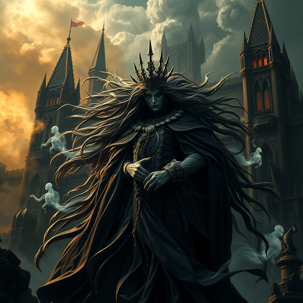 "Majestic royalty enveloped in darkness, with long windblown hair and flowing garments reminiscent of Magic the Gathering, set against a background of a massive dark castle. The scene is imbued with vibrant contrasts, featuring clouds of toxic fumes and spirals of smoke that form ghostly apparitions. The regal figure strikes a captivating pose, crafted with intricate detail by the visionary Massimo Caggese. This artwork embraces ominous and intricate elements showcased on ArtStation, capturing dramatic shadows and orthodox symbolism. The ambient occlusion highlights the emotional depth and tribal dark fantasy elements, creating a stunning wallpaper that is an ultra-detailed quality 3D render. Developed in Blender, utilizing Unreal Engine technology, the piece is enhanced with VFX and cinematic lighting, offering an isometric perspective. Ultra-realistic and rendered in 8k, this cinematic masterpiece encapsulates the essence of a mystical realm."