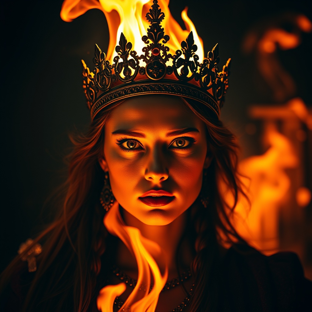 Majestic ruler of flames, a regal figure emerges with a crown ablaze, her fiery aura casting dramatic shadows, her eyes reflecting the inferno's dance with photorealistic detail, the scene imbued with an epic atmosphere, warmth and intensity coalescing in a striking display of elemental power.