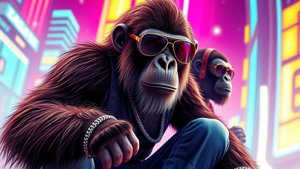 Majestic ruler of the apes, exuding a casual yet commanding fashion sense, adorned with sleek sneakers and stylish sunglasses, donning chic jeans, set against a vibrant futuristic backdrop, embodying the essence of cyberpunk with a full figure, a visual masterpiece of unparalleled quality, showcasing intricate details in a photorealistic high-resolution display, with an air of bold creativity and sophistication.
