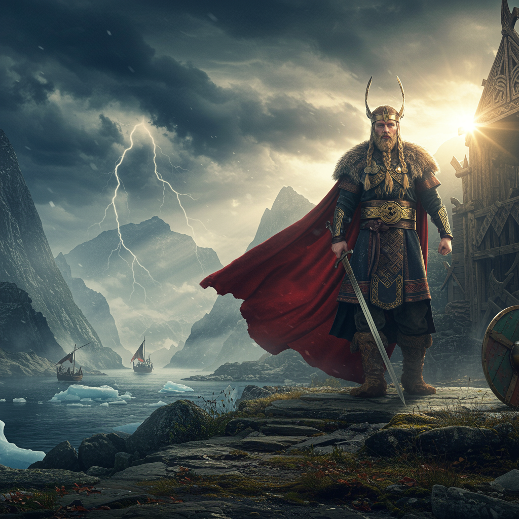 Majestic ruler of the Norse, lifelike and vibrant, featuring vivid colors with dynamic, intricate details, dramatic cinematic lighting, ethereal sunbeams, high dynamic range, towering presence in panoramic glory.