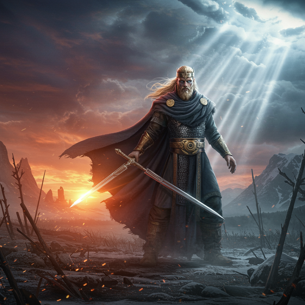 Majestic ruler of the Norse, photorealistic, vibrant hues, dynamic action, intricate details, dramatic lighting, ethereal rays, high dynamic range, towering amidst a Nordic landscape, mythical aura, flowing cloak, chiseled features, atmospheric depth, windswept hair, commanding presence.