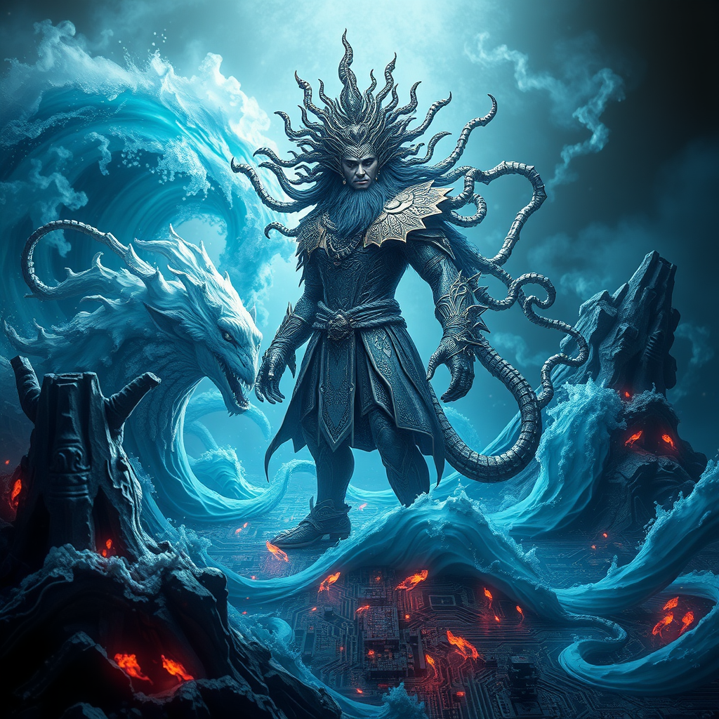 Majestic ruler of the ocean amidst spiraling waves and ethereal blue mist, with strikingly perfect features, his imposing full body stands firmly on intricate circuit board ground, clad in elaborate, fantastical attire. The scene is a dark fantasy illustration, reminiscent of an ArtStation masterpiece, hyper-maximalist and overwhelmingly detailed. This cinematic portrayal captures sharp focus with intense shadows and vivid lighting, rendered in Ultra-detailed Quality 3D Octane, creating a photorealistic concept art. The composition is perfectly balanced, developed for high-quality, high-definition display, evoking a tribal aesthetic with a captivating, HDR wallpaper finish in 8k resolution.