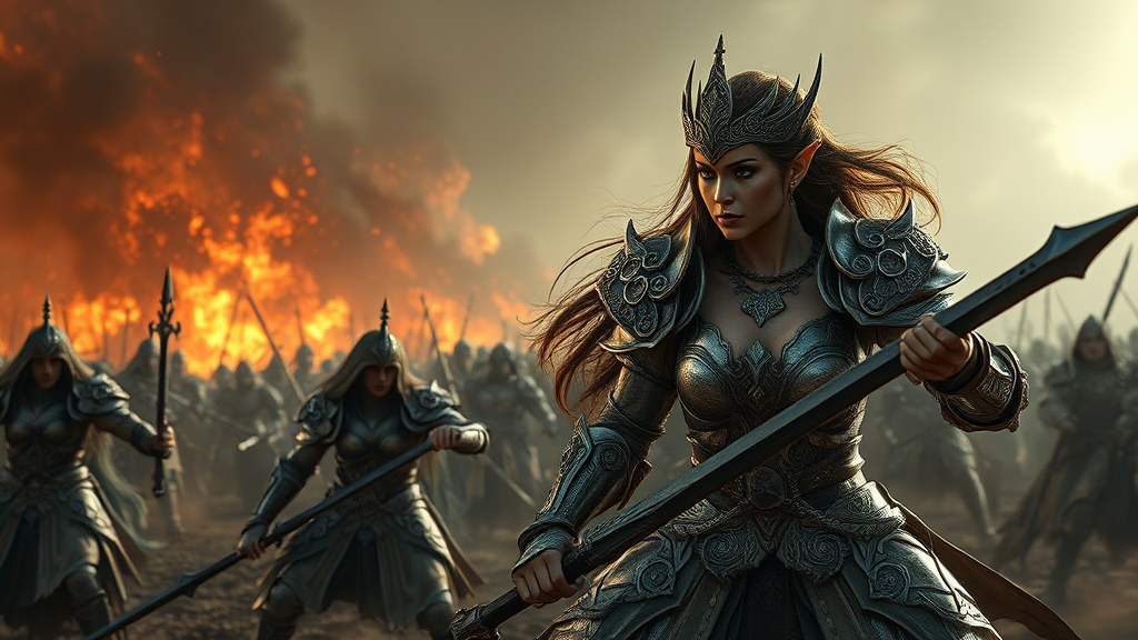 majestic scale, fierce warriors, enchanting woman, elf, stunning, beautiful, epic clash, poised in motion, powerful, fury, goddess, intricate armor and weaponry, lost battlefield, fiery backdrop, partial veiling, sweeping shot, aerial view, dark fantasy, cinematic CGI, deep focus, sun rays breaking through, photorealistic, highly detailed, complex maximalist, hyperrealistic, in the style of Dragon Age