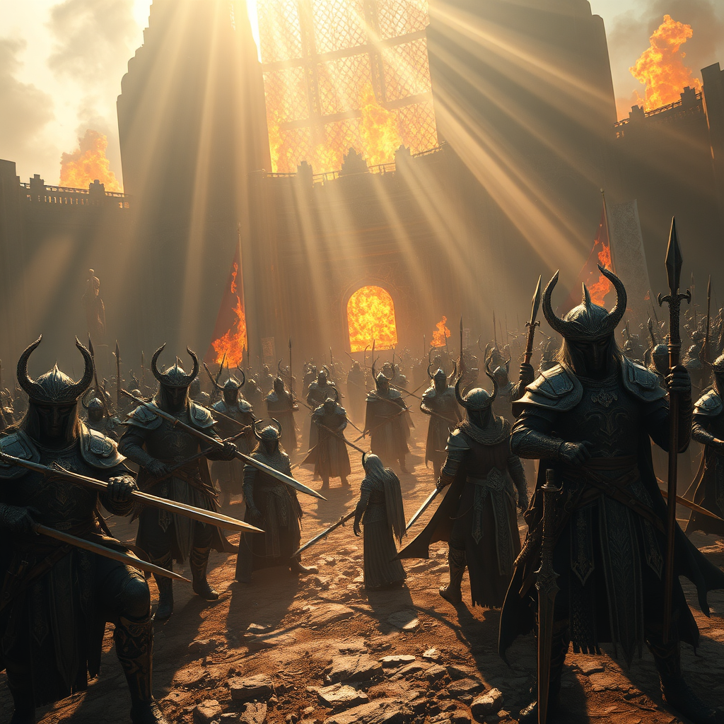 Majestic scale warriors, fierce elven woman, adorned in breathtakingly intricate armor and wielding beautifully designed weapons, standing amid a legendary forgotten battlefield. The backdrop is a towering wall of fire, casting flickering shadows and creating a dramatic interplay of light. The scene is captured in an epic wide shot from above, showcasing an aerial perspective that highlights the grandeur of the dark fantasy setting. The atmosphere is vivid with CGI precision, utilizing depth focus to bring out every detailed and complicated, maximalist element. Crepuscular rays pierce through the scene, adding a divine touch of god-like power as sunbeams illuminate an epic battle frozen in powerful slow-motion, encapsulating the rage and presence of a true goddess. The photorealistic and hyperrealistic portrayal mirrors the aesthetic of Dragon Age, capturing a world steeped in myth and wonder.