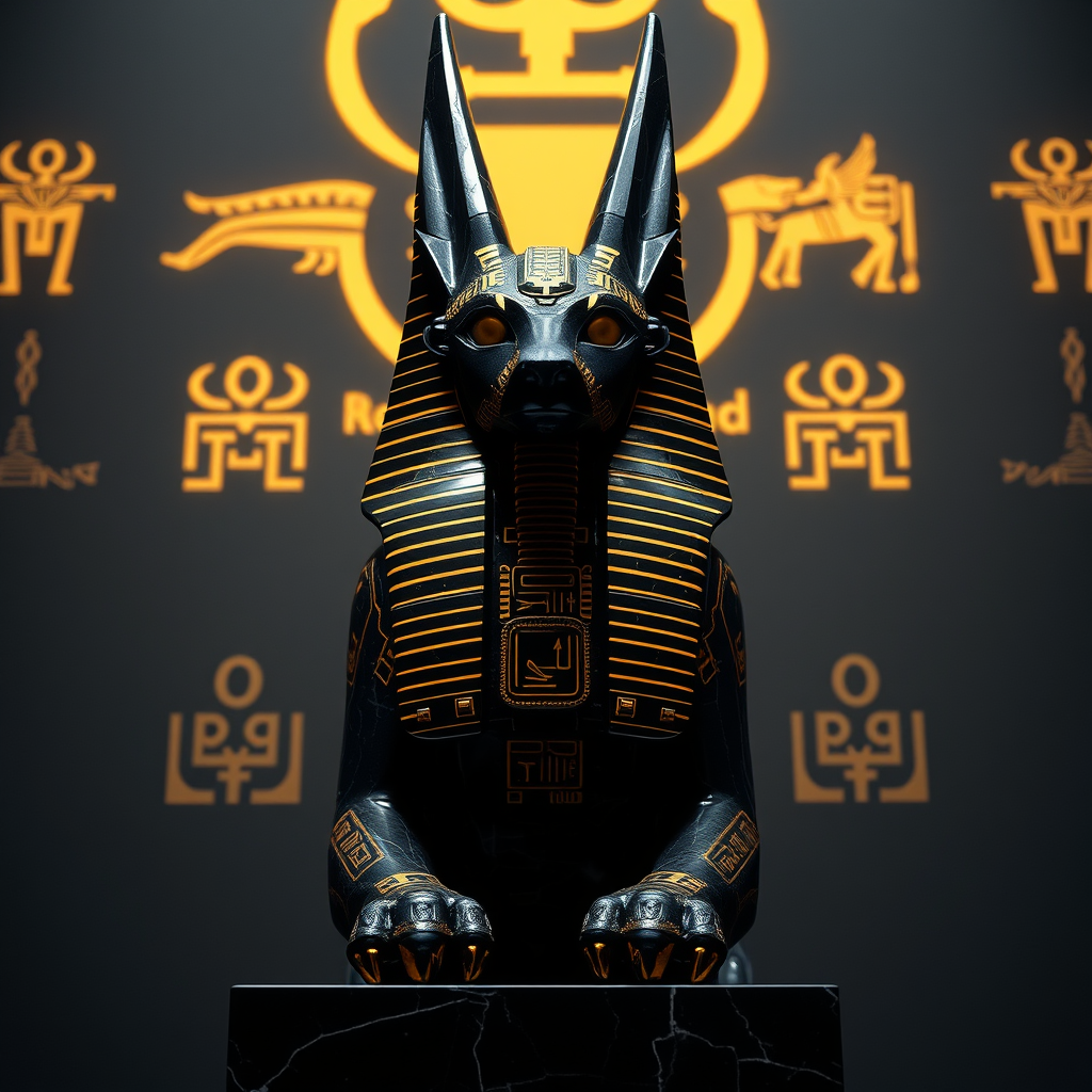 Majestic sculpture of Anubis "God of Transition" in an ultra-modern reinterpretation, blending ancient Egyptian and futuristic design. The imposing figure is intricately complex, crafted in sleek black granite with gold inlays and featuring modular, sacred hieroglyphs. Set against a dark backdrop illuminated with softly projected Egyptian symbols made of light. The atmosphere is grandiose and dignified. Captured in a portrait shot, central and focused, with laser-cut precision and hyper-detail. Sci-fi elements merge with futuristic-Egyptian aesthetics.