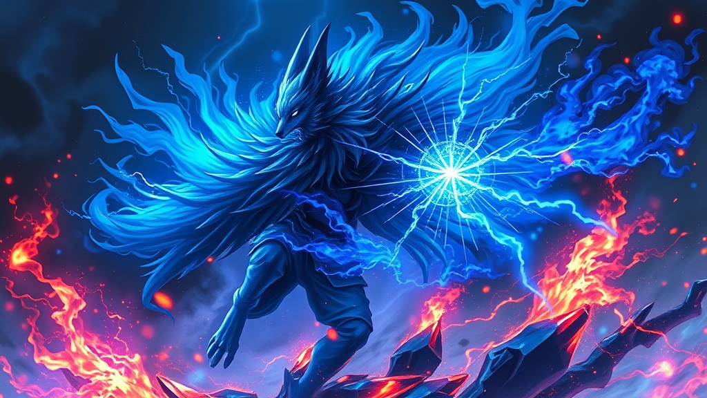 Majestic shadow fox unleashing intense azure energy flames anime, 8K RESOLUTION, SORCERER HUMANOID MALE PRINCE of twilight DOMINATING in battle, cobalt hellfire AND EMBERS swirling in background, APOCALYPTIC, VIVID, Complex, Graceful, Digital Artistry, Picturesque, Ultra-Detailed, 8k, LIGHTNING-TEMPEST.