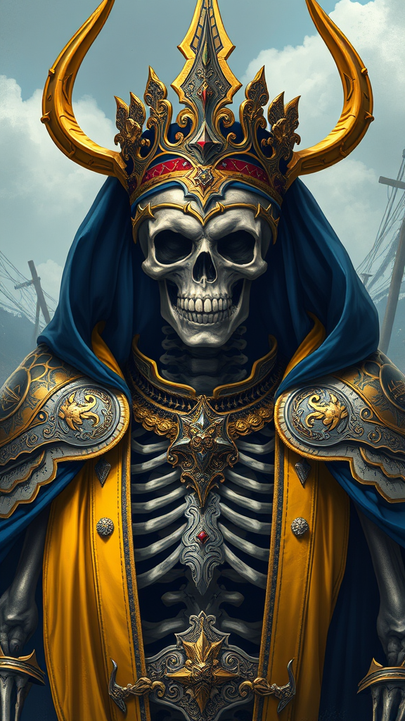 Majestic Skeleton King of the Underworld, adorned in intricately crafted Nordic armor, exuding elegance and authority. A digital illustration showcasing hyper-realistic and hyper-detailed features, set in a scenic backdrop. The regalia is embellished with royal yellow and deep ultramarine blue, drawing inspiration from the styles of Artgerm, WLOP, Greg Rutkowski, and BROM. The composition captures the essence of grandeur and power, avoiding duplication or distortion, maintaining a sharp focus with every element in frame and of high quality.