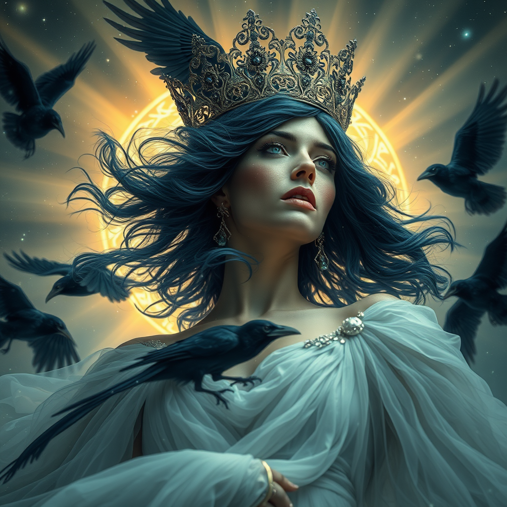 Majestic sovereign of ravens in motion, seductive enigma, cosmic tendrils, orchestrating the cosmos, frosty azure locks::3, eyes with a hue of deep indigo, fantasy realm, adorned in a celestial silk gossamer gown, imbued with stars and galaxies, full figure portrayal, reminiscent of John Singer Sargent, a delicate crown intricately designed, shot from below, beams of divine light::4, inspired by Greg Rutkowski, iridescent golden halo backdrop, remarkably lifelike, intricately detailed environment, featured on art platforms, dark fantasy allure, atmospheric hyperrealism, exquisitely detailed, panoramic vista, ultra-realistic depiction, in sharp focus, rendered with cinematic flair, --aspect ratio 16:9.