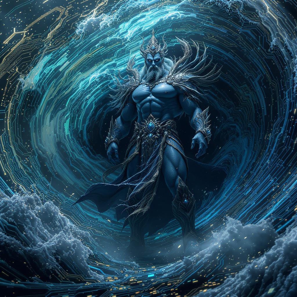 Majestic sovereign of the ocean, an imposing man dominating a vortex of spiraling waves, enveloped in ethereal blue mist; his visage is flawless and dignified. He stands firm on a surface resembling a circuit board, adorned in intricate, ornate attire that speaks of a fantastical realm. The scene is reminiscent of a dark fantasy, blending cinematic depth with hyper-detail, fusing tribal elements with high-tech aesthetics. The artwork features photorealistic 3D render quality, showcasing ultra-refined details in sharp focus and perfect composition. Lighting is dramatic, casting intense shadows that enhance the high-definition, 8K resolution atmosphere. This vividly complex piece embraces a hyper-maximalist style, ideal for a striking wallpaper or HDR display.