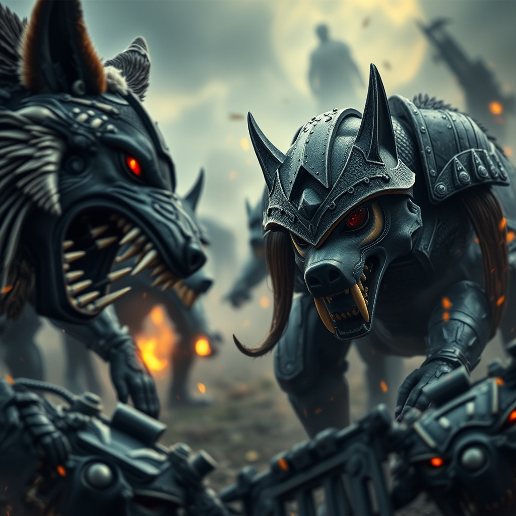 majestic space wolves space marine clashes with orcs on expansive battlefield epic and dynamic action scene cinematic drama intense lighting award-winning high detail realism masterpiece sharp focus 8k uhd hdr raw candid cinema featuring a female warrior studio-quality shot textured skin intricately detailed pupils captured with a cinematic lens