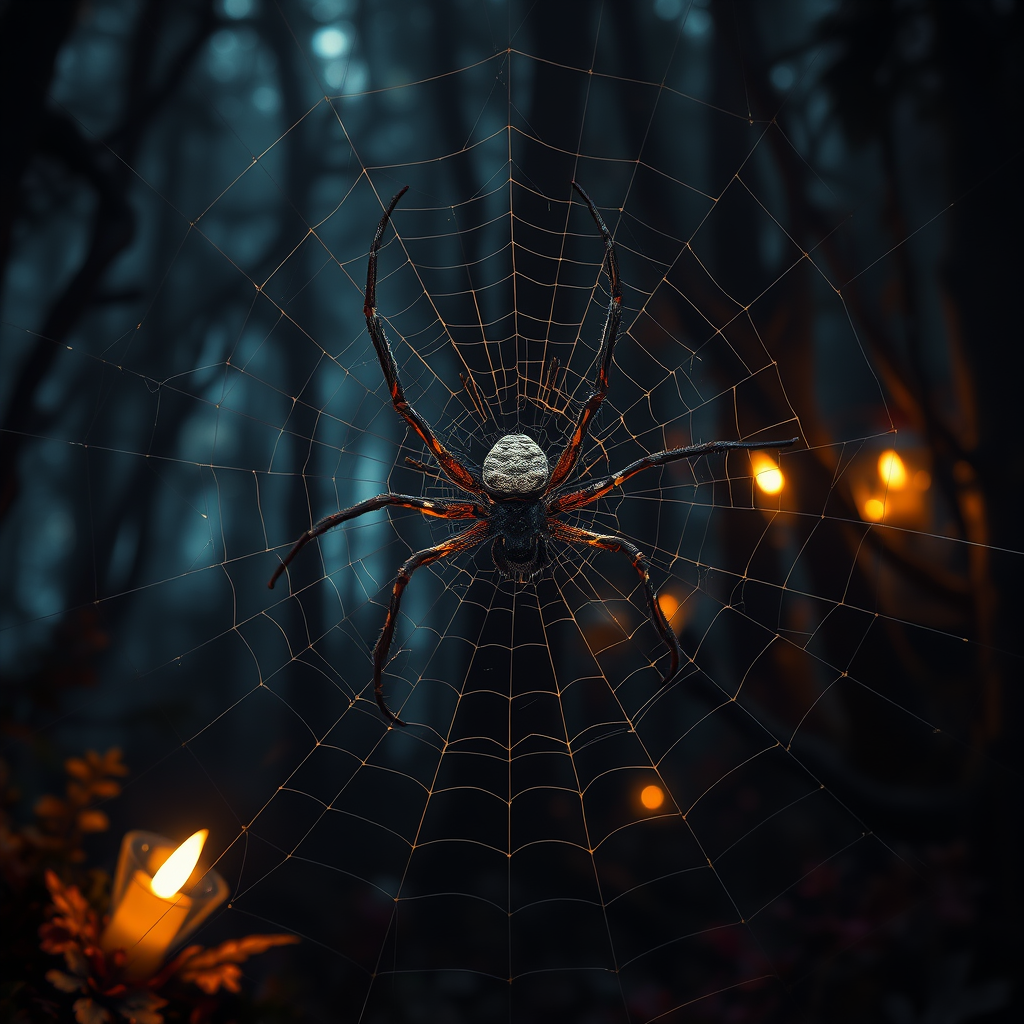 Majestic spider weaving an intricate web in a mystical forest, shrouded in dramatic shadows and illuminated by soft, ethereal light. The setting has a captivating fantasy allure, enhanced by stunning visual effects and rich, dark tones. The spider's metallic sheen contrasts with the vibrant, enchanting landscape. Out of frame elements hint at a greater world beyond, with a subtle sense of mystery.