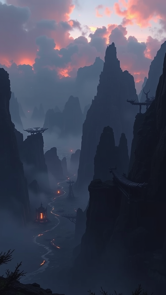 Majestic twilight landscape, dark fantasy realm, full HD resolution with 8K clarity, intricate and finely detailed concept art, crafted using Unreal engine, featuring atmospheric depth and enhanced by volumetric lighting, capturing a scene trending on Artstation, with ethereal mist and enigmatic shadows.