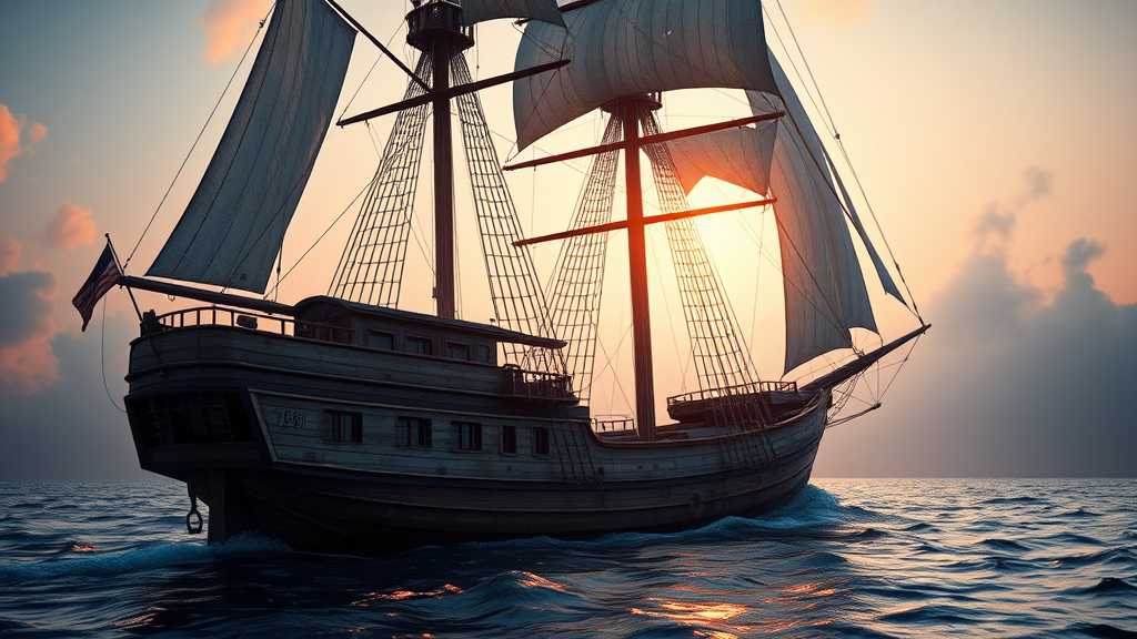 Majestic ultra-realistic sailing ship illuminated by a dramatic pale sunrise, showcasing cinematic lighting with a weathered and battered appearance, captured from a low angle. The scene is trending on ArtStation, presented in stunning 4k resolution with hyper-realistic, focused details. The intricate artwork is enhanced by Unreal Engine 5, achieving a cinematic masterpiece vibe. The piece is infused with the enchanting style of Studio Ghibli, and features the detailed artistic approach of John William Turner, creating an awe-inspiring and vivid portrayal of maritime beauty.