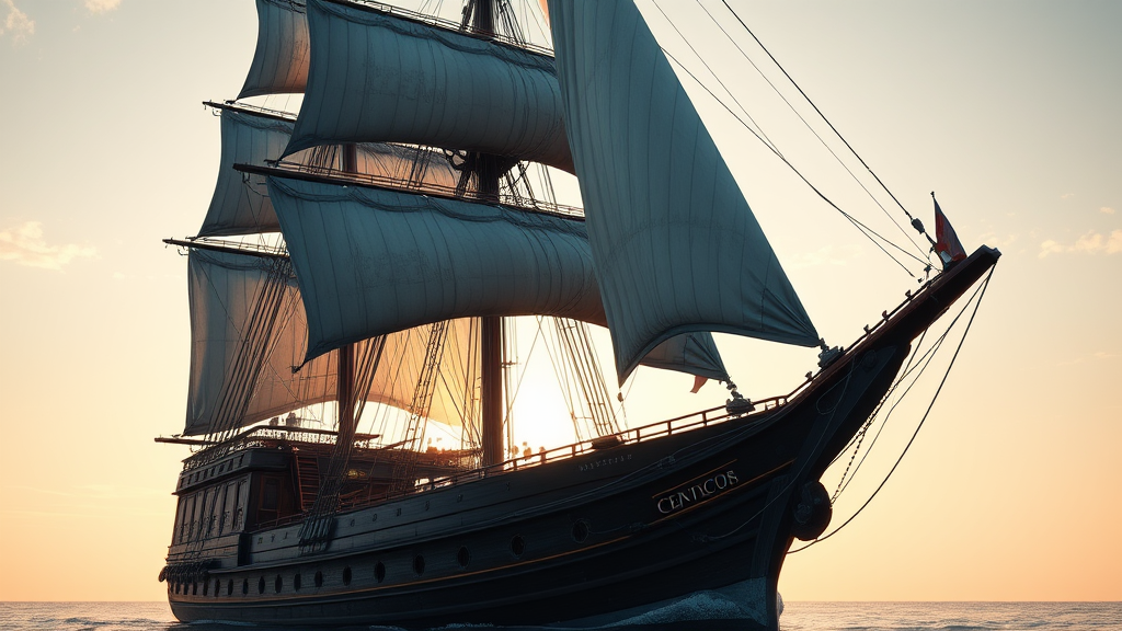 Majestic ultra-realistic sailing ship under dramatic pale sunrise, cinematic lighting casting intricate shadows on its weathered hull, low angle view highlighting its grandeur, capturing the trending essence of artstation with 4k hyper-realistic focus, extreme details akin to Unreal Engine 5 artistry, an epic masterpiece reminiscent of Studio Ghibli's magic with intricate touches inspired by John William Turner's timeless artwork.