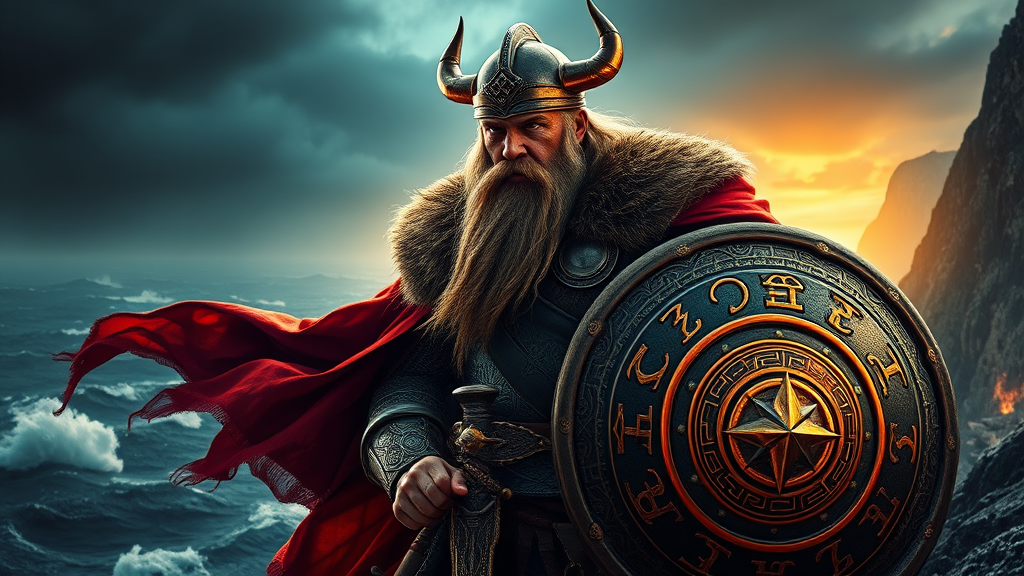 Majestic Viking ruler, photorealistic, vivid colors, dynamic and ultra detailed, dramatic cinematic lighting, ethereal volumetric rays, high dynamic range, imposing figure with fierce expression, intricately designed armor and helm, flowing red cape, standing atop a rugged cliff overlooking a storm-tossed sea, long beard caught in the wind, ancient runes glowing softly on his shield, aura of power and mystery.