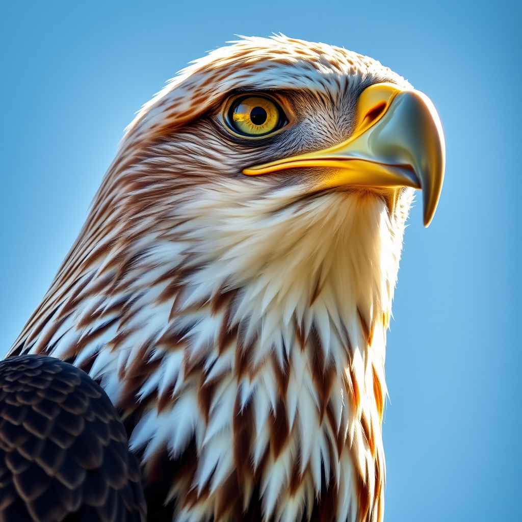 Majestic visage of an eagle with piercing eyes and intricate feather patterns glistening in the sun.
