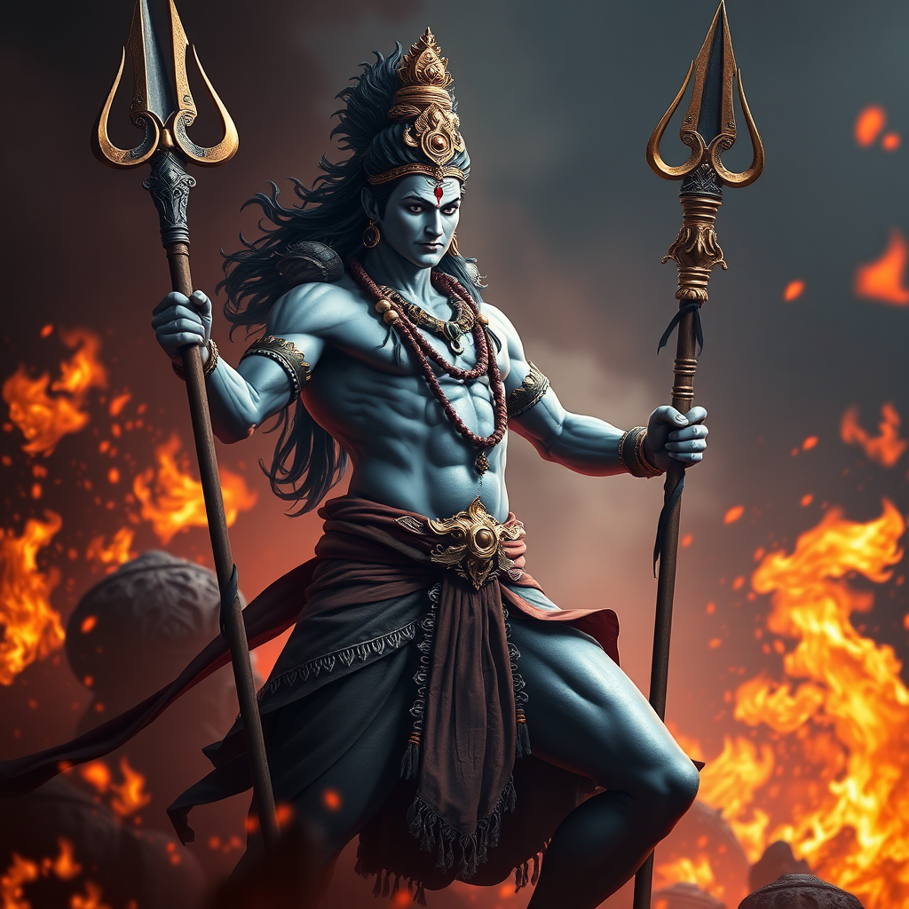 Majestic warrior inspired by Lord Shiva from Indian mythology, envisioned as a One Piece character with a perfectly balanced physique, wielding a three-pronged spear with intricate designs, full body portrayed in extreme detail, illuminated by cinematic lighting with a high contrast, artstation quality character concept art, 8K resolution, set against a backdrop of roaring flames, combining traditional elements with a contemporary twist for a unique visual experience.