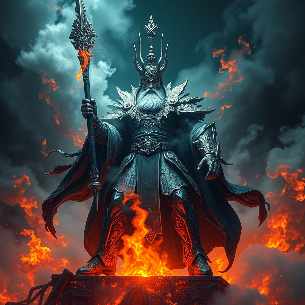 Majestic warrior king engulfed in swirling inferno, surrounded by fog and mist, exudes power with his flawless visage, full body stance on intricate circuit board, adorned in elaborate attire. A fantasy illustration inspired by dark fantasy, featured on ArtStation, showcasing a hyper-maximalist overdetailed style. Rendered in 8k resolution, the piece exemplifies ultra-detailed 3D Octane realism, emphasizing sharp focus and perfect composition with dramatic shadows and lighting. Designed as a high-quality, high-definition wallpaper in HDR, maintaining intense stylization and a 2:3 aspect ratio.