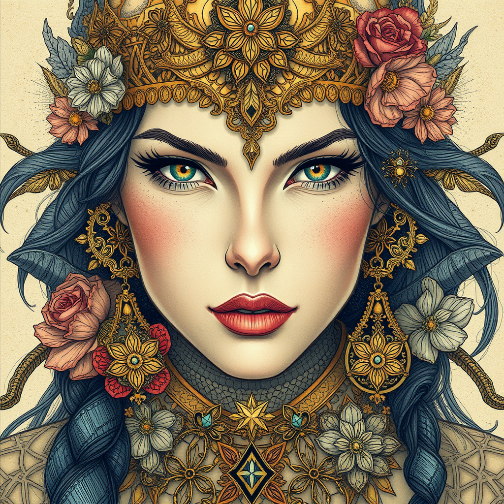 Majestic warrior queen| balanced| focal masterpiece| elaborate| exquisitely detailed| awe-inspiring elegance| delicate linework| vivid| all-encompassing cinematic| inspired by Carne Griffiths| reminiscent of Conrad Roset