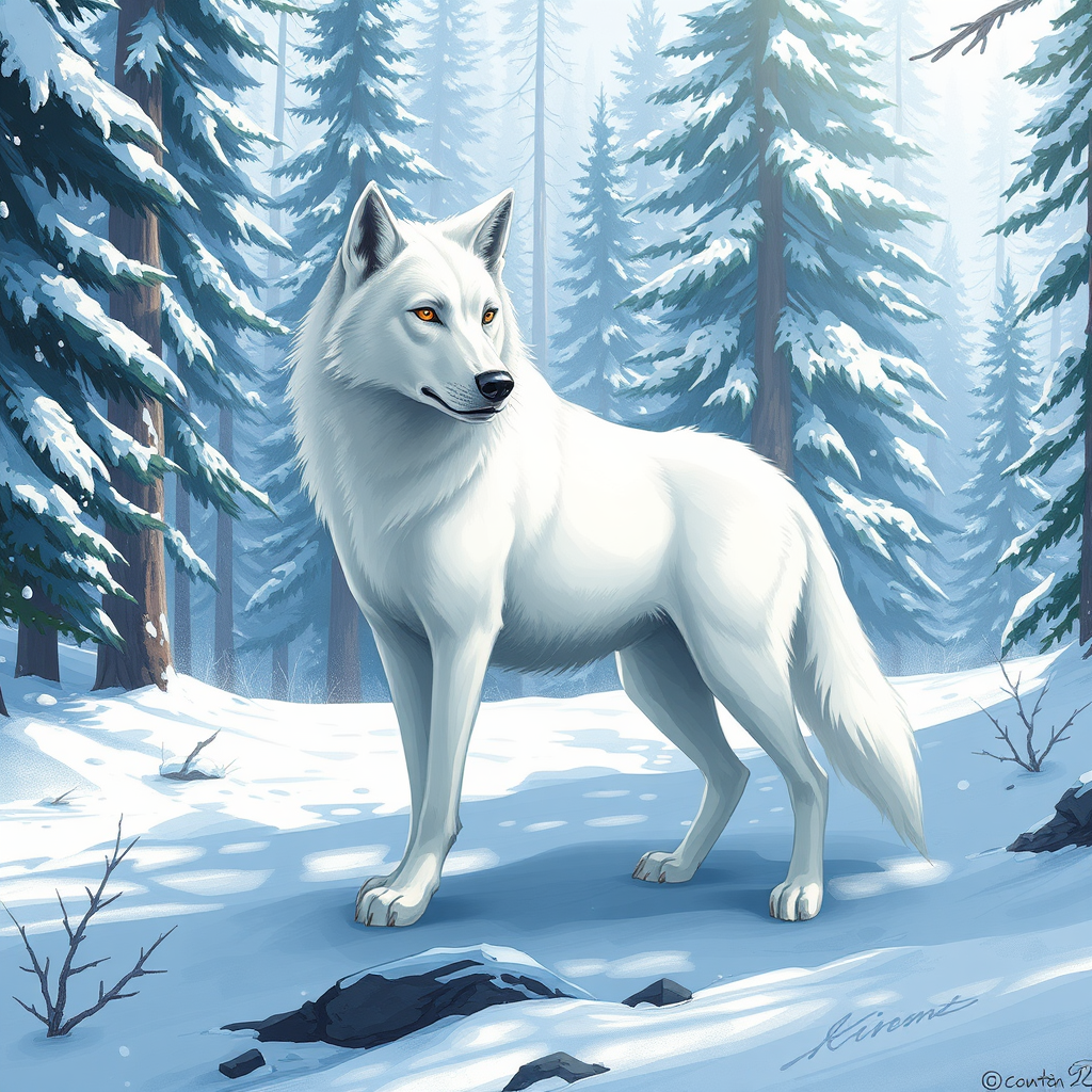Majestic white wolf standing proudly in a snow-covered forest, surrounded by towering evergreen trees, concept art in an anime-inspired style, 2D painting capturing a portrait of the wolf in full body, striking a dynamic pose with an alert stance, set against a vividly dynamic winter background, emphasizing the serenity and mystique of the forest in an expressive style, accentuating the quiet embodiment of wilderness and spirit.