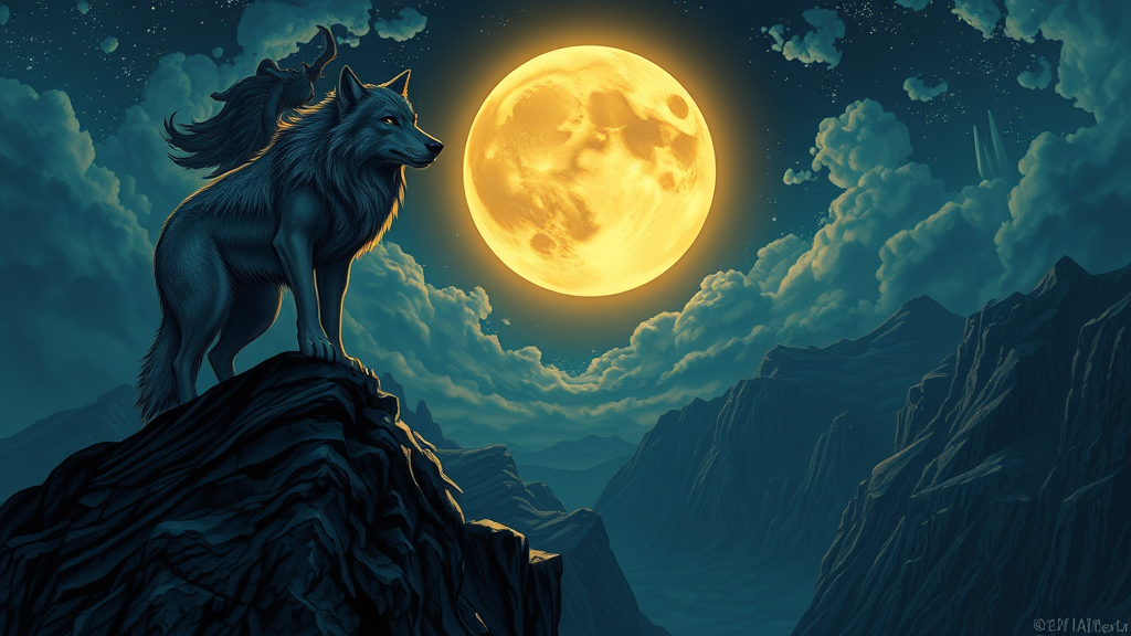 Majestic wolf perched on a rocky cliff, its silhouette striking against a magical moonlit sky. The moon, impossibly large and glowing, casts an ethereal light across the scene, illuminating each fur strand with breathtaking detail. The landscape, rich with intricate patterns and vivid colors, merges the surreal artistry of Don Maitz, the dynamic shadow play of Todd McFarlane, and the whimsical charm of Mary Blair. The night air shimmers with blink-and-you-miss-it details that captivate the senses. An awe-inspiring blend of nature's grandeur and artistic brilliance creates an unforgettable spectacle.