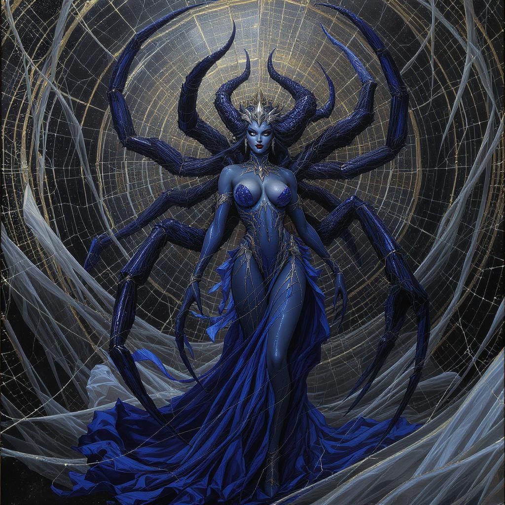 Majestic woman queen of spiders, eledrae inspired, envisioned in the style of Boris Vallejo, enriched with dark sapphire and silver hues, embodying polished metamorphic beauty, featuring trompe-l'œil illusionistic intricacy, modern-day arachnid-queen portrayal, characterized by bold brushstrokes, stripcore elements, with an aspect ratio of 1:2, version 5, style score 300, quality level 5, enhanced beta upscaling, version 5.