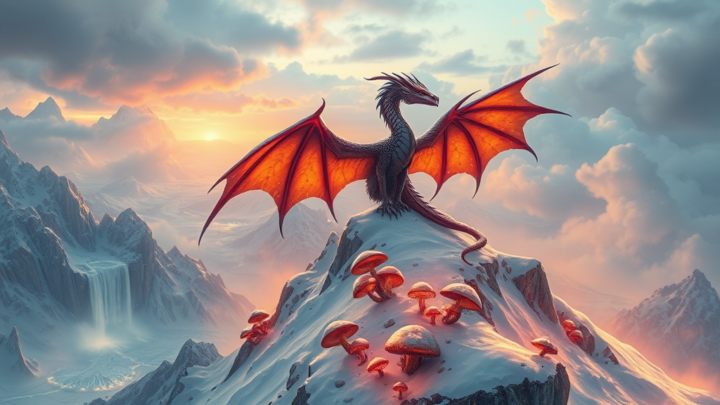 Majestic Wyrm of Ember Skies perched atop snowy peak of Aetherstone Mountain, surveying ethereal landscape of glistening ice islands and shimmering waterfalls, bathed in soft radiance of iridescent mushrooms and glittering stardust, exuding an aura of primordial enchantment and mystique over vast expanse of iridescent vapor clouds and glittering crystal caverns.