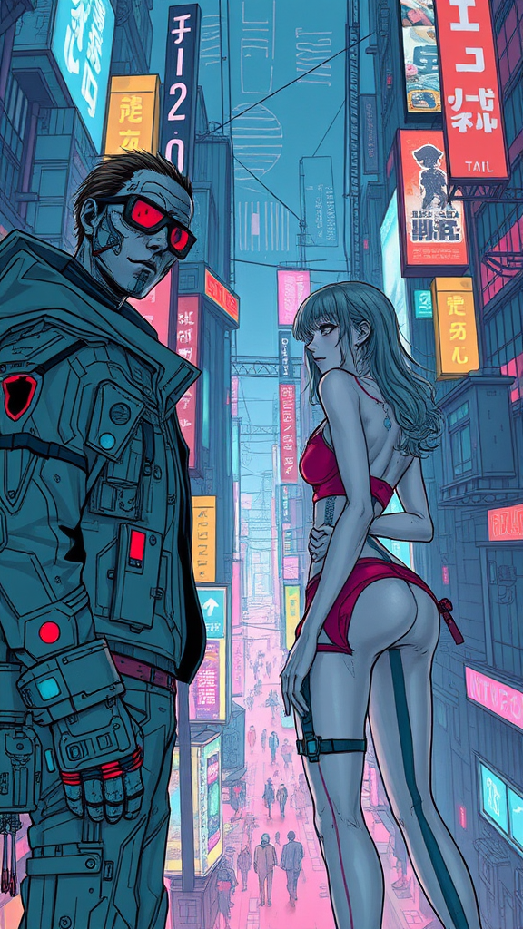 Male and female cyberpunks in NeoTokyo, centered, showcasing key visual elements with intricate and highly detailed designs. Emphasizing breathtaking beauty with precise lineart, vibrant colors, and a comprehensive cinematic feel. Inspired by the work of Carne Griffiths and Conrad Roset, highlighting the essence of a dystopian future. Featuring a complex urban landscape with layers of neon lights and futuristic technology. Avoiding common art flaws such as disfigured anatomy, out-of-frame elements, or poorly drawn hands and feet. Emphasizes the interplay between technology and humanity, while maintaining pristine clarity without distractions like watermarks or text.