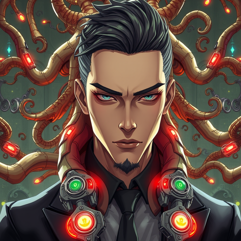 Male anime character with organic tendrils of giygas, embodying the essence of a forest druid in a sleek business suit. Ultra-realistic depiction of a retro-futuristic male cyborg, blending punk art and robotic elements. A masterpiece showcasing intricate, highly detailed features and sharp technological rings, inspired by James McCarthy and Beeple. Infused with the visionary style of Ayami Kojima, this artwork is a painting and 3D render crafted in Unreal Engine. It features intricate abstract nouveau filigree scrollwork from Tooth Wu, WLOP, and Dan Mumford, with elements of concept art, capturing the essence of the Library of Gems. This trending ArtStation piece by Greg Rutkowski is a coherent and symmetrical cinematic artwork, emphasizing hyper-realism and high detail using Octane Render. Presented in 8K resolution with iridescent accents, it evokes the enigmatic allure of Albedo from Overlord amidst a tapestry of intricate abstract designs.