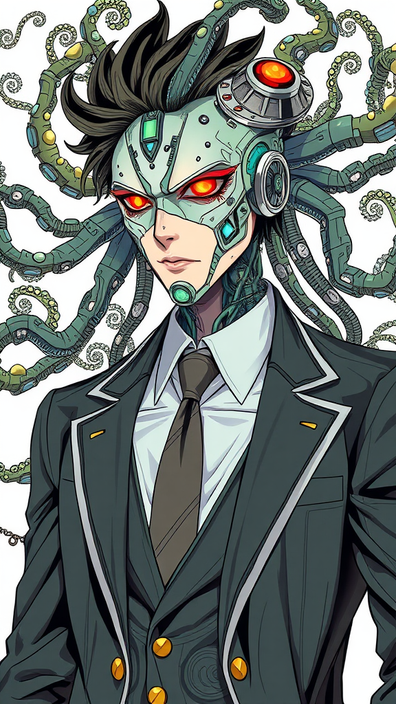 Male anime character with organic tendrils reminiscent of Giygas, embodying a forest druid aesthetic in a sharp business suit. Illustration of an ultra-realistic, retro-futuristic male cyborg with punk art influences; a masterpiece featuring intricate, highly detailed designs with sharp technological and organic elements. Inspired by artists like James McCarthy, Beeple, and Johfra Bosschart in the distinctive style of Ayami Kojima. Combining robot features with intricate abstract patterns reminiscent of nouveau filigree scrollwork, crafted by Tooth Wu, WLOP, and Dan Mumford. Concept art rendered in Octane, trending on ArtStation, featuring a cinematic key art style with hyper-realism and 8K resolution. It incorporates iridescent accents and symmetrical artwork akin to Greg Rutkowski's vision. This creation blends the complex themes of Albedo from Overlord and the fantastical essence of the library of gems, encapsulating both high detail and unique artistic modifications in a coherent, vibrant display.