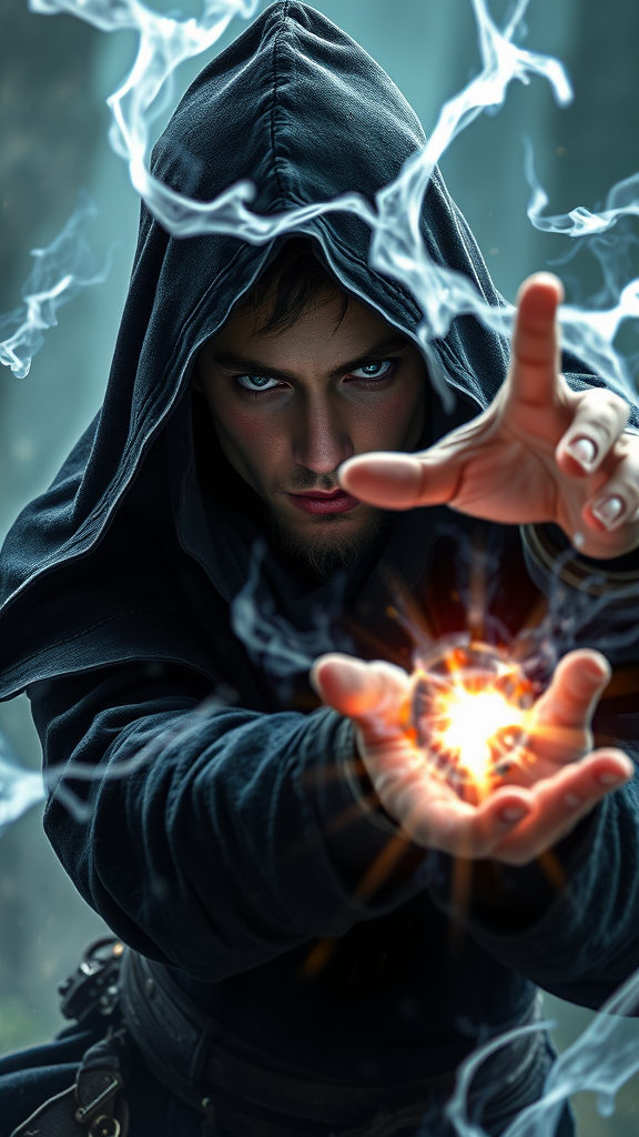 Male elf casting a powerful spell, Dalamar The Dark from Dragonlance inspiration, enigmatic male elf wizard in magical combat, wearing a black hood, mysterious and intense. His detailed face and piercing eyes convey wisdom and mastery over magic. The scene is a masterpiece of the highest quality, 8k, photorealistic, influenced by the styles of Jeremy Mann, Sandra Chevrier, and Maciej Kuciara. The image is sharp and realistic, complete with natural shadowing in a 3D setting, capturing the essence of a battle-hardened and skillful wizard without compromising original features like extra limbs or childlike traits.