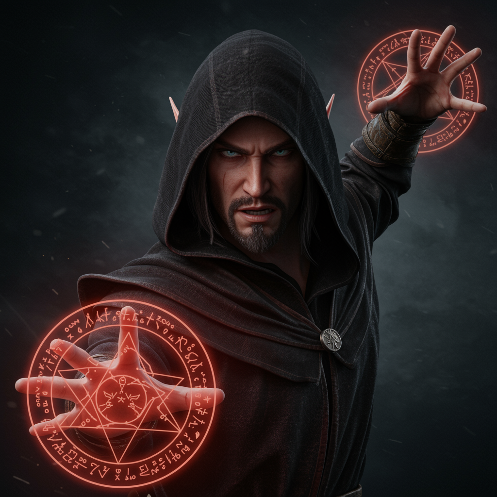 View this AI-generated image featuring male elf casting a powerful spell inspired by dalamar the dark from dragonlance wearing a black hood mysterious elf wizard engaged in magical combat featuring a detailed face and expressive eyes photorealistic masterpiece in 8k quality with realistic shadows ca