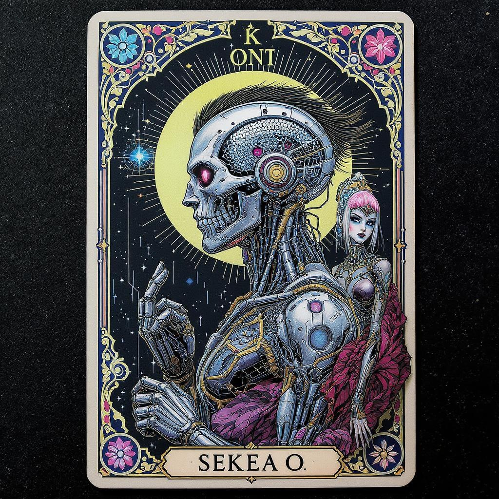 View this AI-generated image featuring a futuristic male figure with a cybernetic body and a cyborg skull designed in the side profile and framed by an intricately detailed border reminiscent of tarot card artistry the piece showcases a cyberpunk theme infused with art nouveau elegance showcasing vi