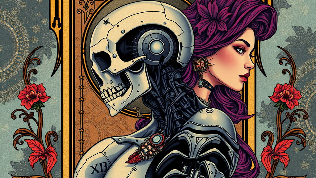 Male figure with a detailed tarot card framing, showcasing a side profile of a cyberpunk-inspired body with a cyborg skull; the design evokes an Art Nouveau feel with an emphasis on intricate details and embellishments. The art is high definition, capturing the essence of concept and digital art. Vibrant synthwave style introduces a female counterpart, enhancing the scene with a blend of classic and futuristic elements.